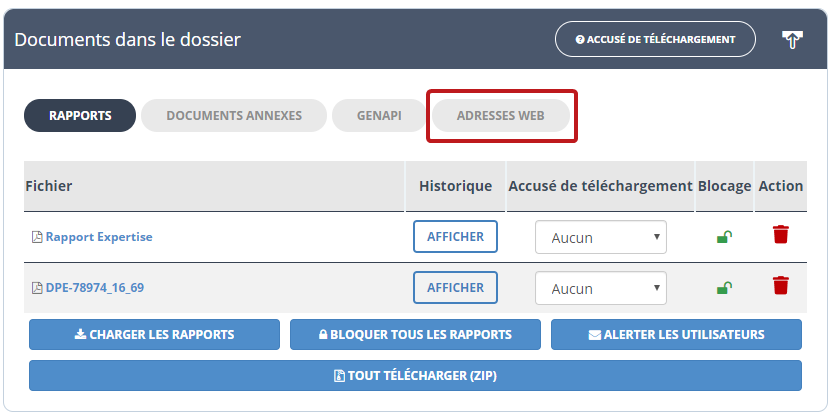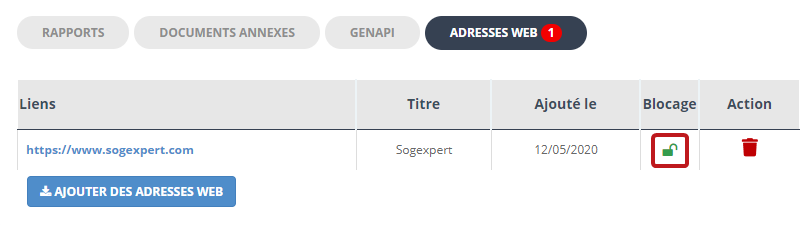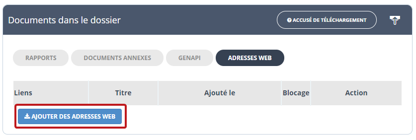 Pour ajouter une adresse web, rendez-vous dans le blocs "Documents" puis cliquez sur l'onglet "adresses web" :